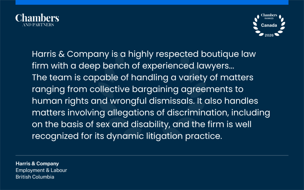 Harris & Company LLP has been recognized in the 2026 edition of Chambers Canada in the field of Employment & Labour in British Columbia and Nationwide.